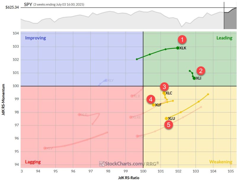 The weekly Relative Rotation Graph continues to show strength in the technology sector within the leading quadrant. Industrials is also maintaining its position in the leading quadrant, with a very short tail, indicating a consistent relative uptrend.